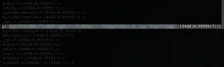 9) Insert the generated encrypted password between the two colons for the pi user like so: